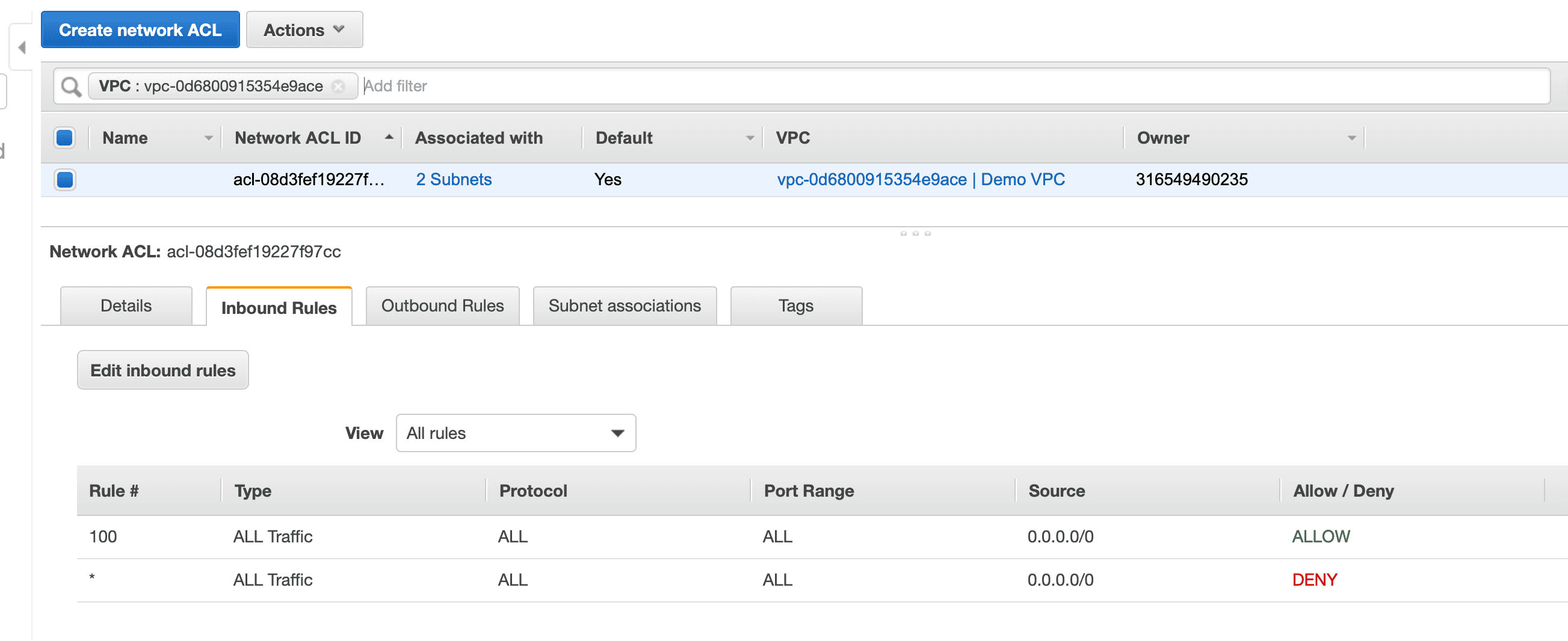 Security groups specify what traffic is allowed to or from an Amazon EC2 instance. Network ACLs evaluates traffic entering and exiting a subnet. Below are the Inbound Rules and Outbound Rules for default Network ACL that’s associated with our subnets in the ‘Demo VPC’. The default network ACL is configured to allow all traffic to flow in and out of the subnets with which it is associated.