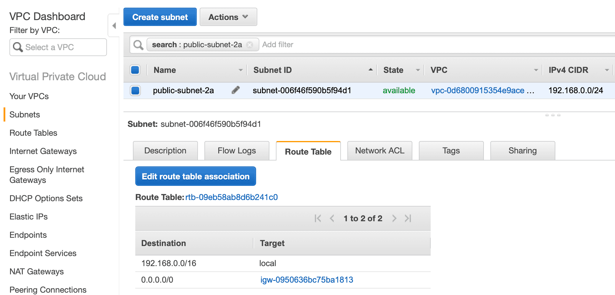 Let’s dissect the entries in the route table. The destination 192.168.0.0/16 should look familiar. This is the network CIDR that we assigned to the VPC. The local target just means that traffic is routed locally in the VPC for 192.168.0.0/16 addresses. This is necessary to allow traffic to flow from an instance in one subnet to another instance in the same or different subnet in our VPC. Now let’s look at the next route entry in the route table. The destination 0.0.0.0/0 is a catch all route whose target is the internet gateway.