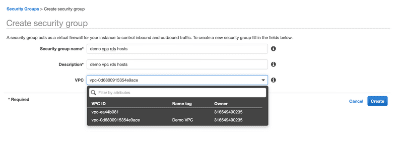 We’ll name the security group ‘demo vpc rds hosts’ and we’ll associate it with our Demo VPC.