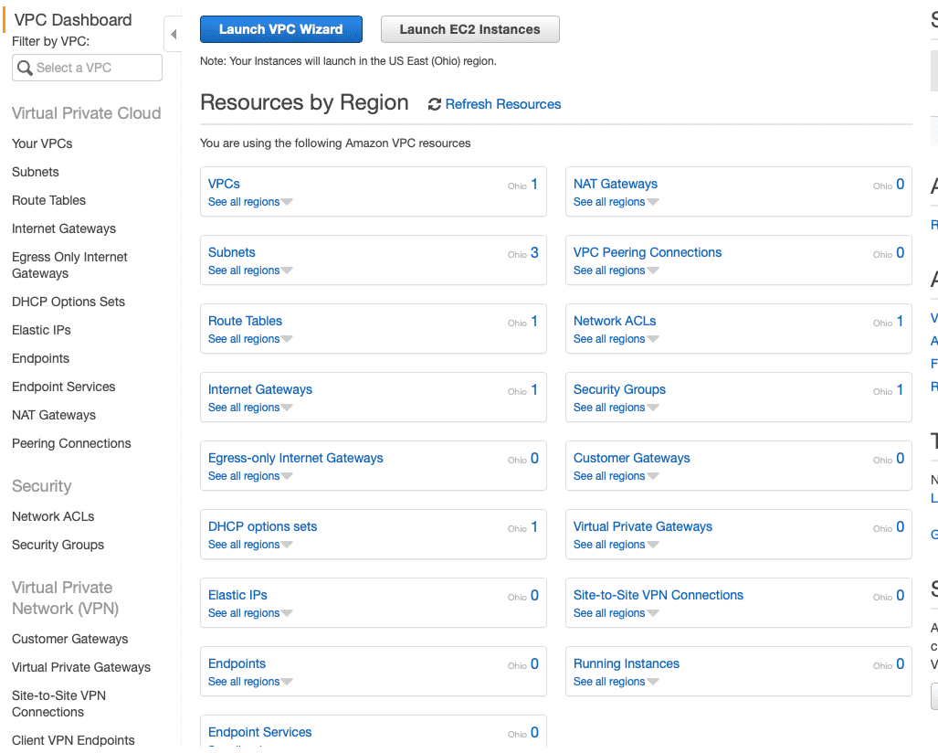 We now have enough context to create our first VPC. Let’s log into the AWS Management Console and select VPC from the Services drop down menu. You should see the VPC dashboard similar to this.